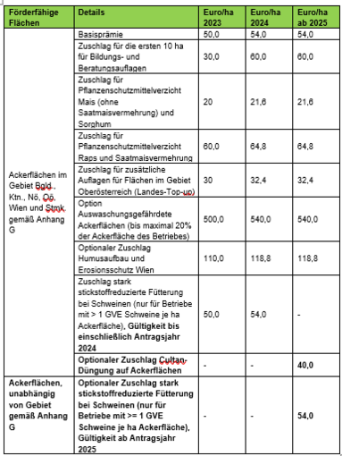 - Nicht förderfähig sind Ackerflächen, die im Mehrfachantrag-Flächen 2020 Grünlandflächen waren. - Optionaler Zuschlag für Flächen im Gebiet Wien: Humusaufbau und Erosionsschutz