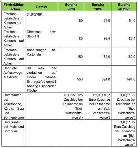 Die Unterstützung wird für Ackerflächen gewährt, auf denen erosionsmindernde Maßnahmen umgesetzt werden. Gefördert werden Kosten und Einkommensverluste, die durch die erosionsmindernden Bodenbearbeitungsverfahren bei erosionsgefährdeten Kulturen bzw. durch die dauerhafte Begrünung von Ackerflächen auftreten.