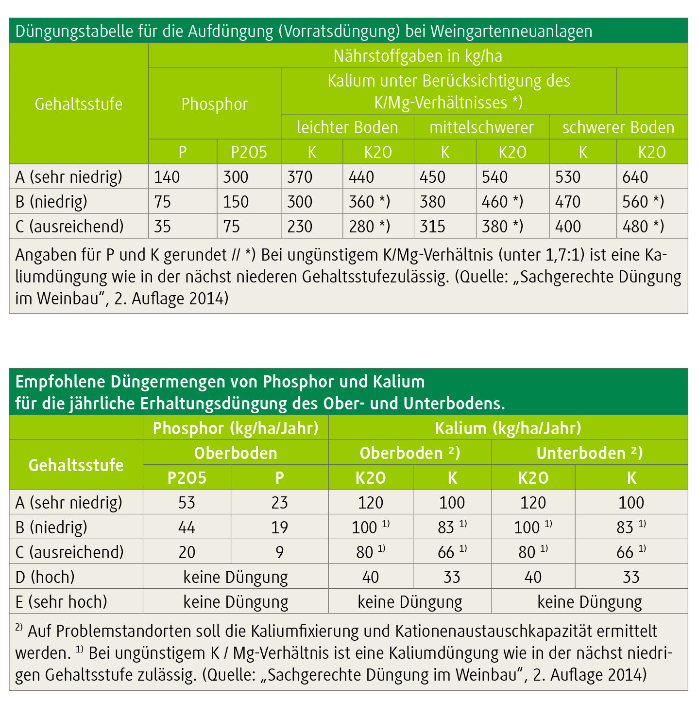 Die Grundlage für die Erzielung einer optimalen Nährstoffversorgung des Weingartenbodens ist die Bodenuntersuchung. Aus fachlichen Gründen wird für eine ausreichend fundierte Düngeempfehlung eine Untersuchung des Ober- und Unterbodens empfohlen. Die Bodenuntersuchung soll alle fünf Jahre wiederholt werden. Bei der Planung einer Neuanlage oder nach Bodenniveauveränderungen sollte grundsätzlich eine Untersuchung des Ober- und Unterbodens erfolgen.