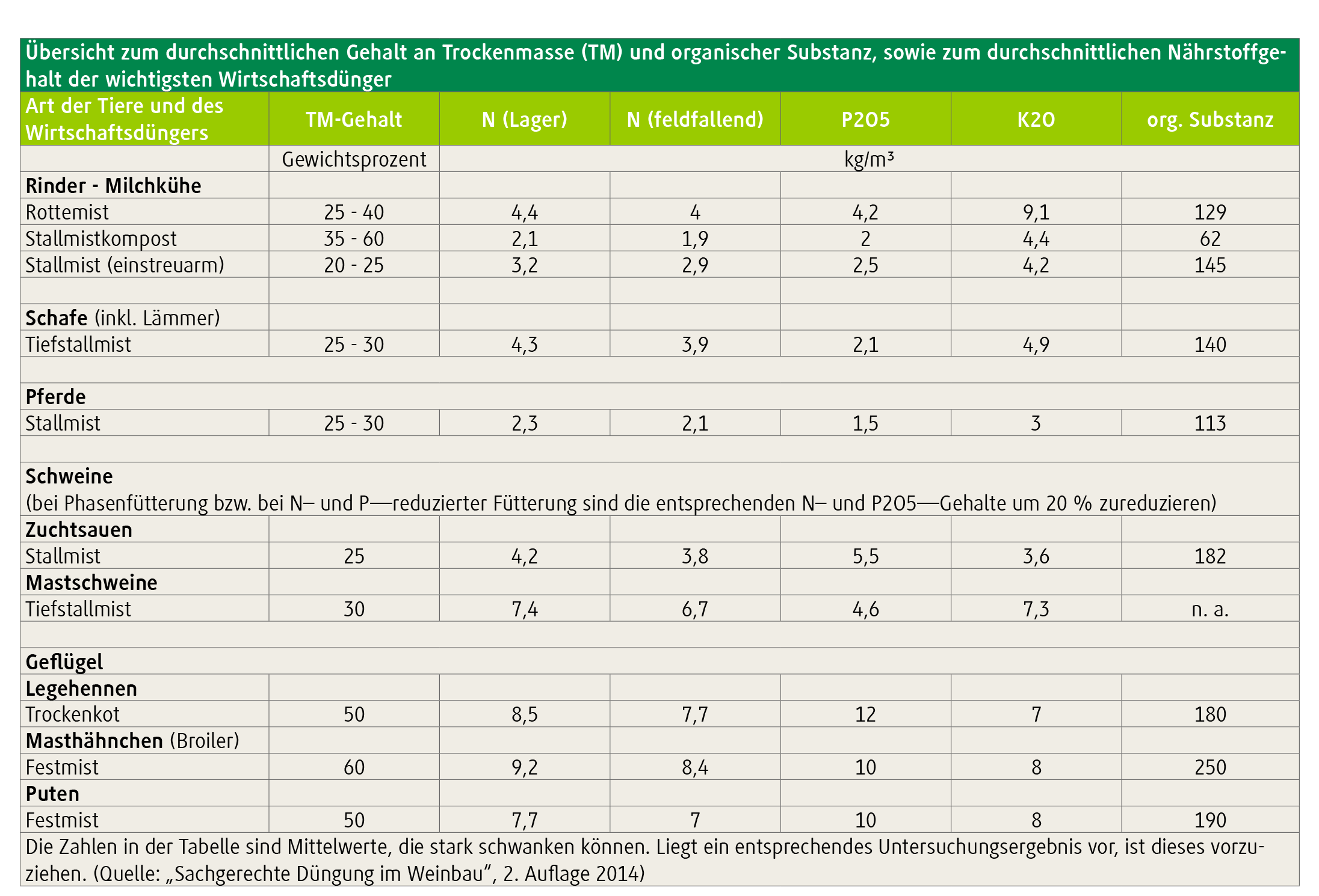 - Gehalt an Trockenmasse (TM) und organischer Substanz PNG 155,03 kBÜbersicht zum durchschnittlichen Gehalt an Trockenmasse (TM) und organischer Substanz, sowie zum durchschnittlichen Nährstoffgehalt der wichtigsten Wirtschaftsdünger