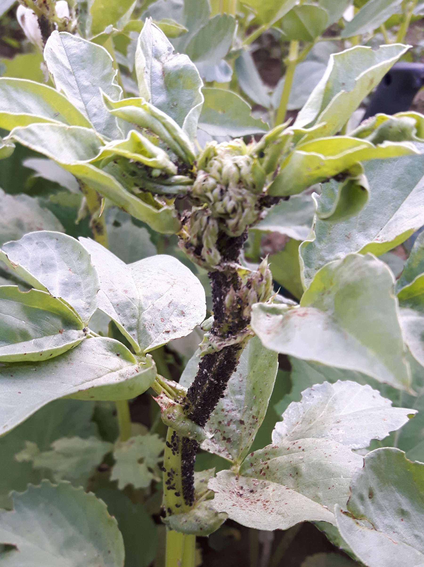 Die gemächliche Schwarze Bohnenblattlaus wechselt den Wirt selten. Ist sie einmal angekommen bleibt sie (bildet die Flugmuskulatur zurück). Sie schädigt v.a. durch ihre Saugtätigkeit. Je nach Befallsintensität kann sie bis über 50 % der Ackerbohnenernte „wegsaugen“ (Pflanzenausfall, Kümmerkörner).